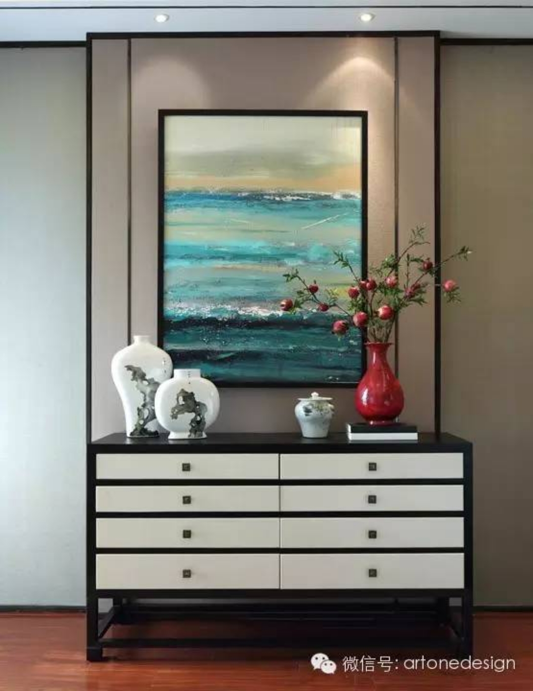 在户型的公共区域,餐客厅功能的切割划分,再加之硬装在户型布局时巧妙的将厨房与餐厅部分相连,使整个空间更具有通透和空间的连贯性,增加了户型的实际使用面积。软装设计方面,通过中国传统茶艺和吉祥物鱼以及手绘花鸟,贯穿餐客厅,寓意着如鱼得水的生活状态和文化的流传。