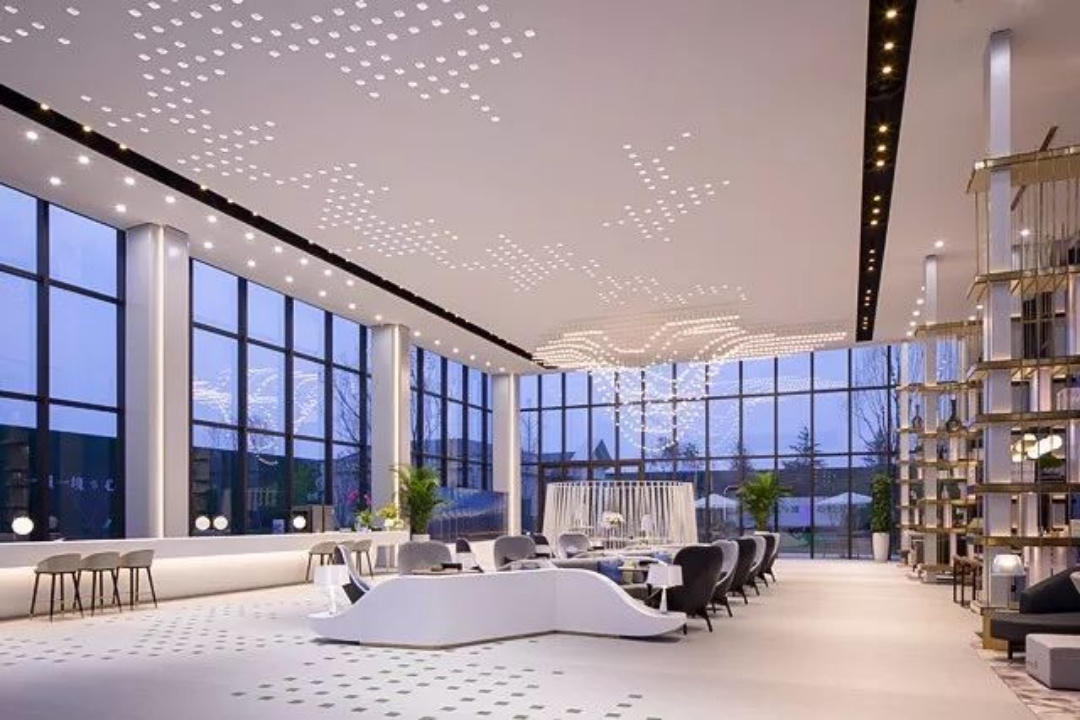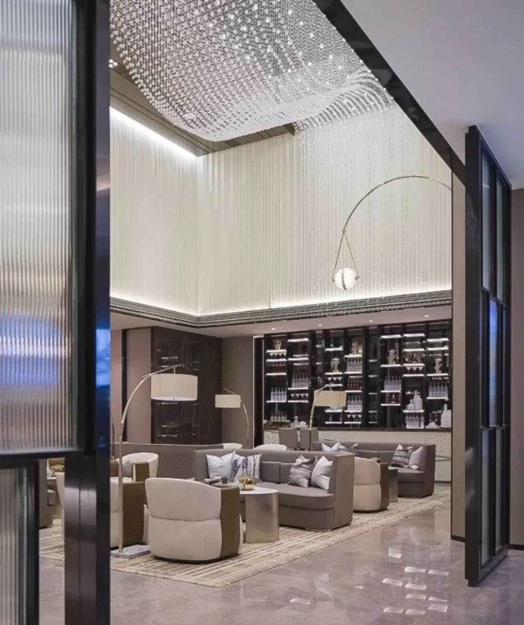 大厅顶部水晶质感材质的大型灯带,像源源不断奔涌的河流;星星点点的灯光,又仿佛万籁俱寂的夜空中繁星璀璨的银河。弯曲的壁灯吊挂着的灯球好似被阳光照射着的球形水珠,散落各处。